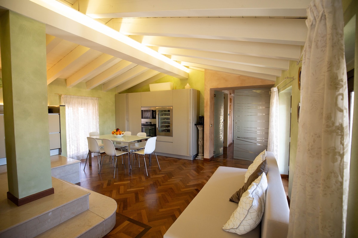 Mindössze 100 méterre a tótól, saját szabadtéri parkolóval. Rivoltella (Desenzano Del Garda) történelmi központjában található, néhány perc sétára minden szolgáltatástól, étteremtől és bártól. A második emeleten található egy hálószobás lakás (lift nélkül) nagy és tágas (75m²), nyitott terű konyha-nappali és félemelet. Két légkondicionálóval, egy 55hüvelykes Smart TV-vel, gyors WI-FI-VEL és egy íróasztallal van felszerelve, így a szálláshelyen eltöltött időd nagyon kényelmes.