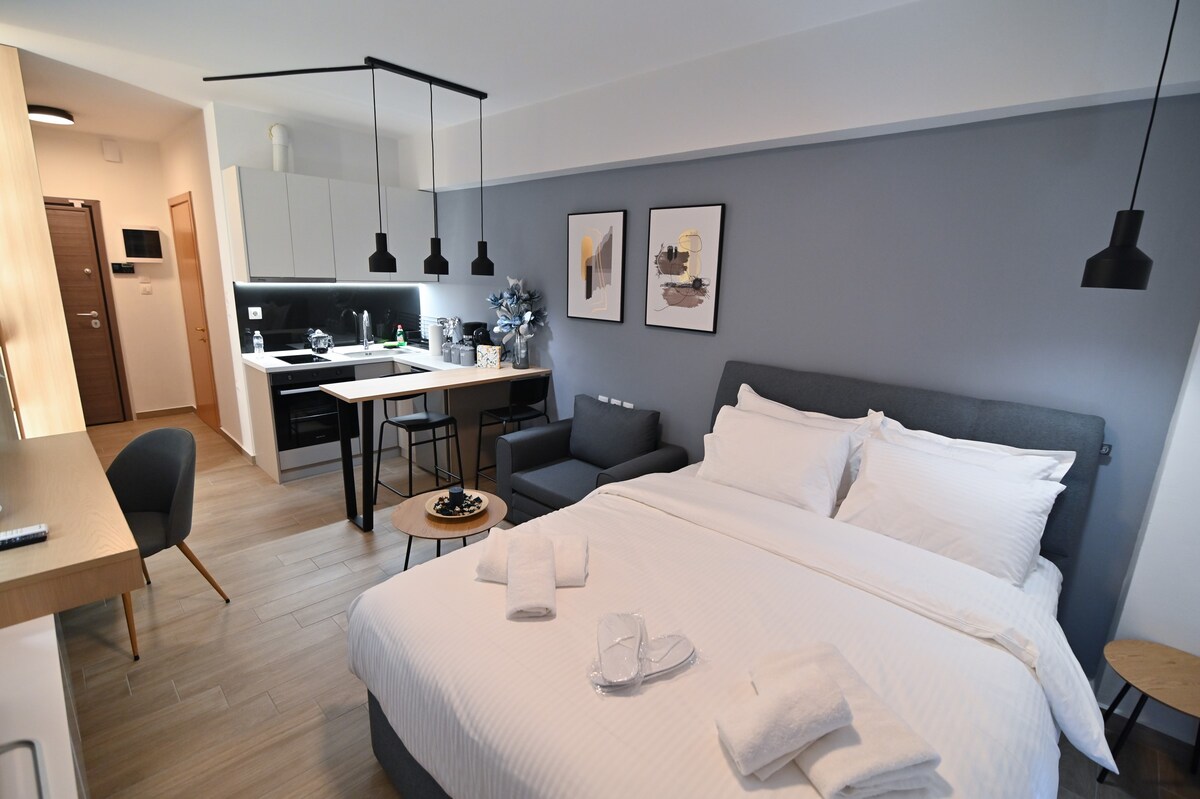 A wonderful, cosy & comfortable semi-basement studio (bedroom, living room, kitchen, bathroom, office) in one of the most beautiful neighborhoods of Larissa. It has individual natural gas heating and is furnished and equipped with all modern comforts (cable TV, Internet 100Mbps etc). It is worth noting that all the furniture and appliances are brand new and were chosen with passion exclusively to meet the needs and requirements of Airbnb visitors. We will be happy to offer you a pleasant stay!