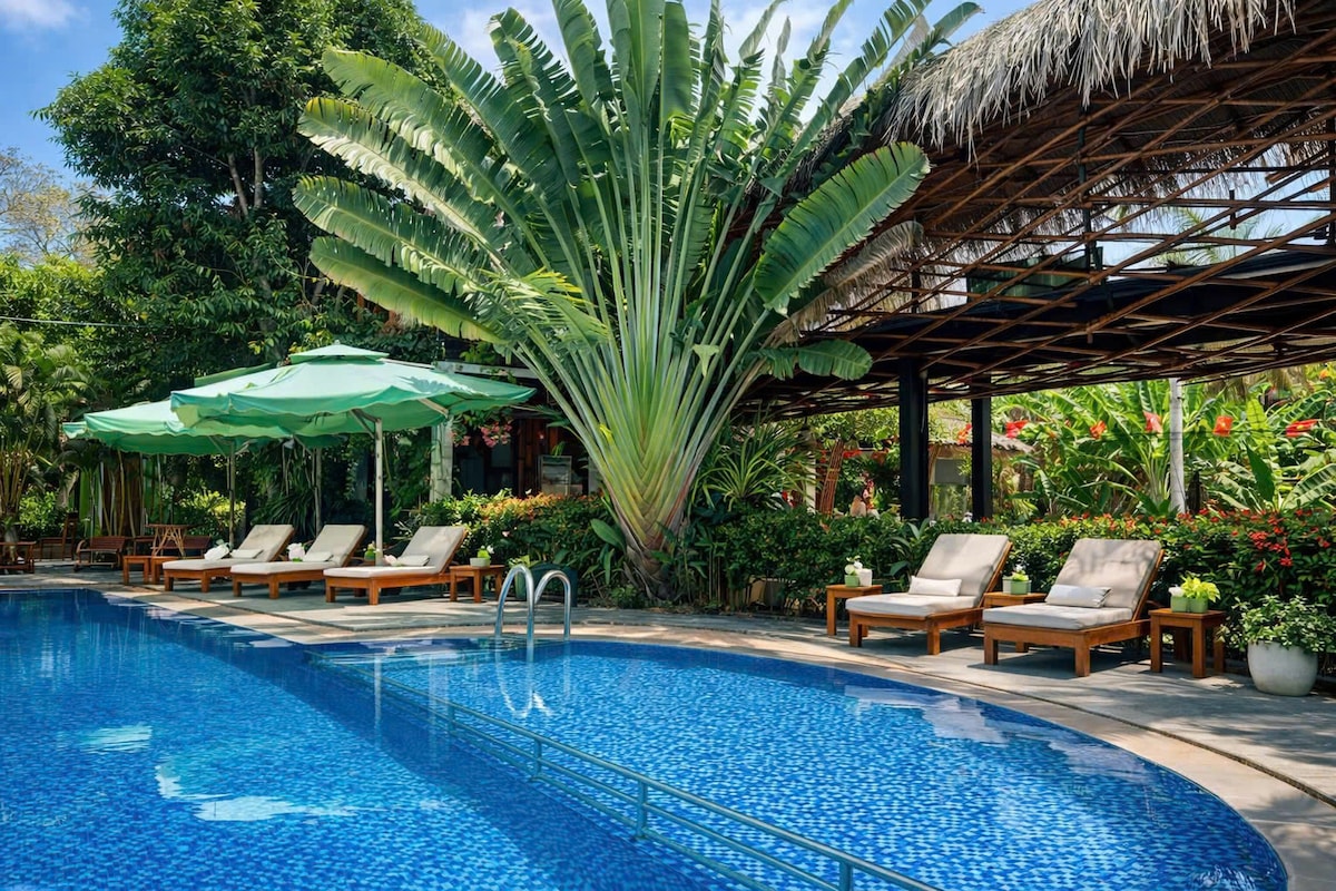 A bugalows egy gyümölcsöskertben található, amely nagyon békés és természetes, így nagyon alkalmas azoknak a turistáknak, akik szorgalmas időtöltés után szeretnének pihenni. A szálláshely a közelben található zöld kis csatornák, így INGYENES kajakkal fedezheted fel ezeket a természetes és szép csatornákat. Emellett a falusiak nagyon barátságosak és szívesen látott turisták érkeznek, így kerékpárunkat is használhatod a helyiek életének felfedezéséhez, valamint számos gyümölcskert meglátogatásához, mint például a lótusz, a rizsföld, az ananász és a mangó.