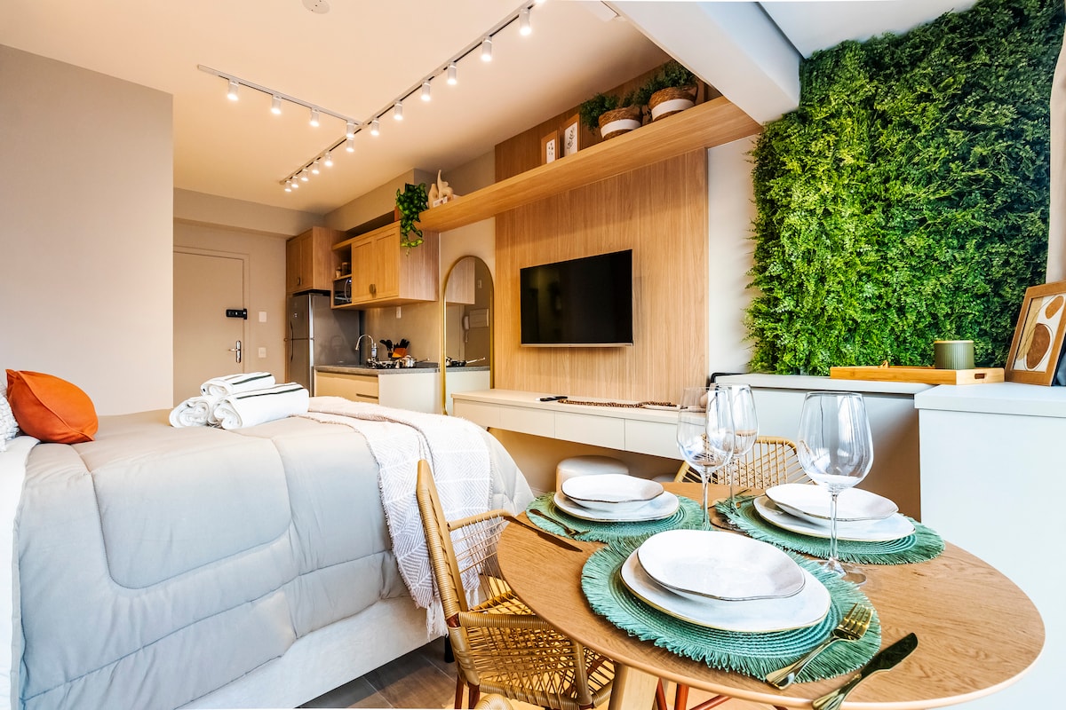 35 m²-es ipari stílusú stúdió a 39. emeleten, panorámás kilátással az Anhangabaú-völgyre. Modern környezet betonnal, szabadon hagyott téglával, fával, fémmel és Caio Fonseca exkluzív falfestményével, amely identitást és hitelességet kölcsönöz a térnek. Közel a bárokhoz, éttermekhez, a Republic gasztronómiai útvonalához, népszerű üzletekhez és színházakhoz/múzeumok/központokhoz. Ideális pároknak, fotósoknak és digitális nomádoknak, akik kényelmet és stílust keresnek São Paulo belvárosában.