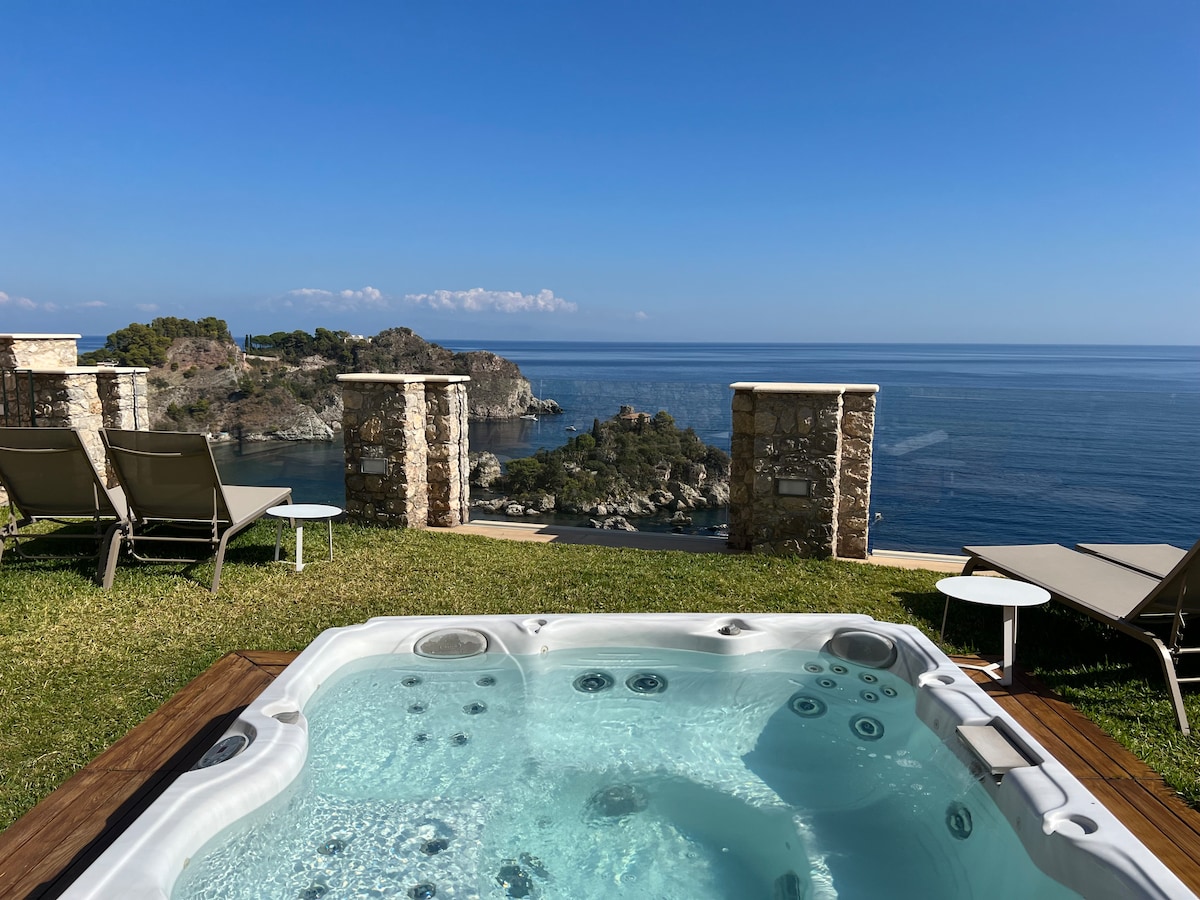 The apartment has a furnished a private terrace facing on the garden and the famous bay of Isola Bella. The terrace is private where you can relax and have dinner. The guests have use of a beautiful jacuzzi with breathtaking view. The jacuzzi is shared with the another apartment.