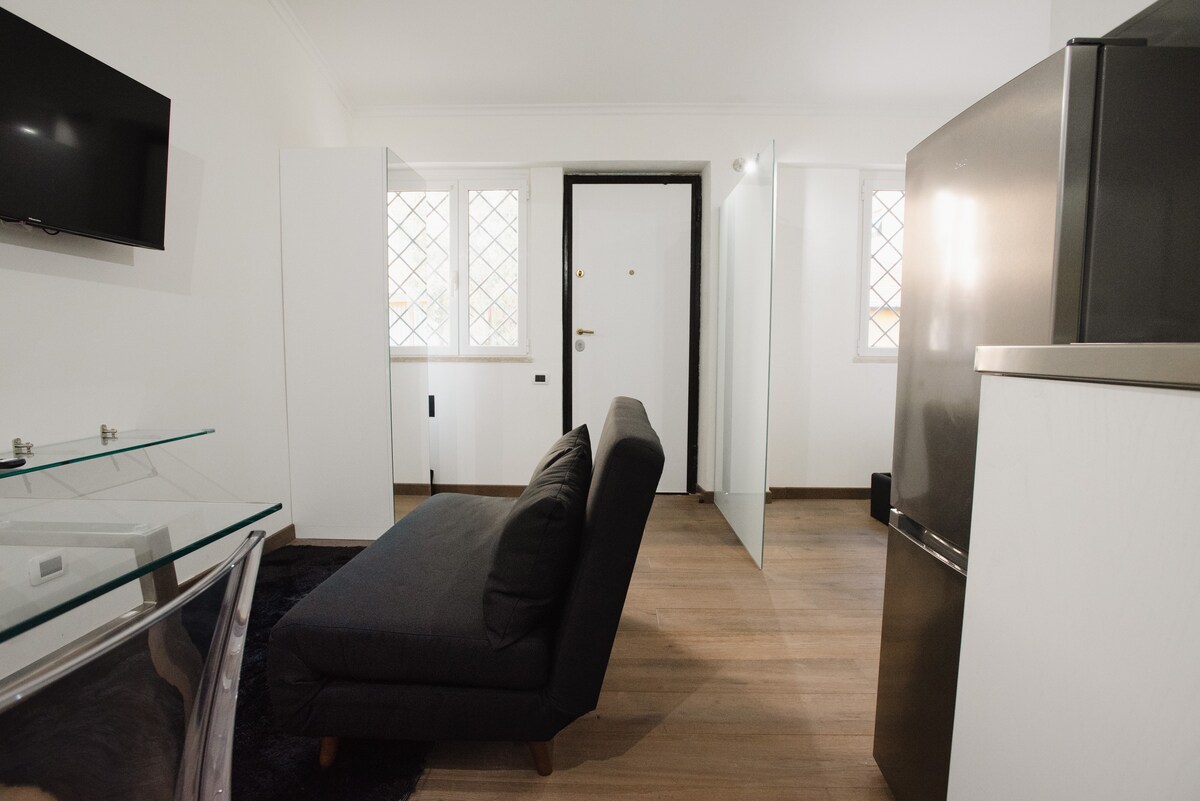 Hangulatos és szép egy szobás stúdiólakás fapadlóval, konyhasarokkal, egy franciaággyal (140 cm), asztallal, kanapéval, ruhásszekrénnyel és nagy fürdőszobával, amelyben fürdőkád és ablak található. Légkondicionáló, mosógép, ingyenes Wi-Fi. Ideális hely egy vagy két embernek, hogy néhány napot Rómában töltsön, a történelmi központ egyik legérdekesebb részén. Negyedik emelet lifttel. Van egy első bejárat, amelyet megosztok velem és másokkal. A stúdiólakás teljesen független. CIN: IT058091C2E3NW5GLB
