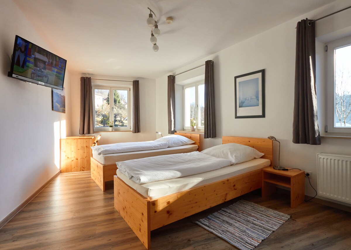 🌿 Üdvözlünk Gräfensteinbergben. Tölts el pihentető napokat tágas, 120 m²-es lakásunkban, ahonnan fantasztikus kilátás nyílik Közép-Frankföldre. Az apartman egy jól karbantartott társasházban található, és egy teljes emeletet foglal el, amely a ti rendelkezésetekre áll. Ideális családok, párok vagy üzleti utazók számára. A Brombachsee és az Altmühlsee mindössze 10 percre vannak, a faluban egy kis pékség reggelente friss zsemlét kínál. 🥐☕