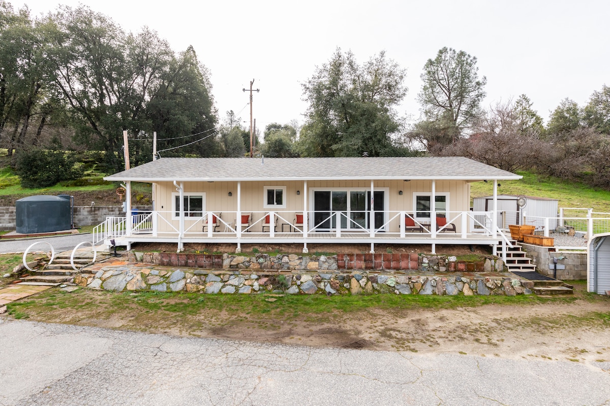 Pihenj a teraszon, és élvezd a gyönyörű napfelkeltét/naplementét a hegyek felett, vagy a hihetetlen éjszakai égboltot. Több mint 12 hektárnyi fenyő és tölgyfa veszi körül a házat. Ez az 525 négyzetméteres emeleti stúdióhelyiség a tiéd, nem oszthatod meg másokkal. Körülbelül 45 perc a Yosemite Nemzeti Park bejáratáig (1 óra a völgy aljáig). Parkolj vagy játssz az egyautós garázsban (fűtés és légkondicionálás), pingpongasztallal és egyéb játékokkal. Elektromos grill a teraszon. Tartalmazza a gofrisütőt, a keveréket és a szirupot, a pattogatott kukoricakészítőt és a pattogatott kukoricát. 10 perc autóútra Mariposától.