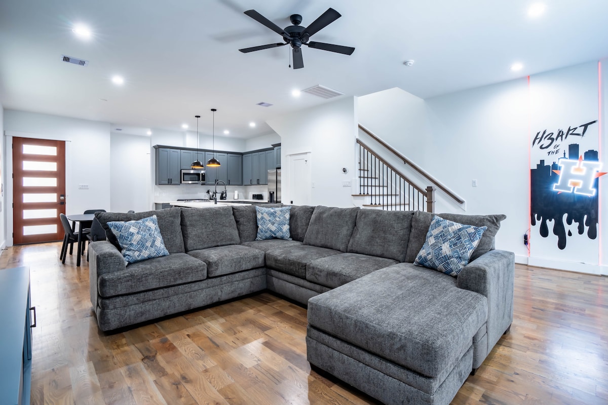 Ez a modern és elegáns városi otthon csoportok vagy családok számára tökéletes szálláshely, ahol akár 10 vendég is kényelmesen elfér. A 3 tágas hálószobával, 3,5 fürdőszobával és 5 ággyal rengeteg hely van a kikapcsolódásra és a kikapcsolódásra. A nyitott koncepciójú nappaliterület stílusosan van berendezve, így barátságos helyet biztosít mindenkinek, ahol összegyűlhet. A Houston belvárosától mindössze 5 percre található szálláshely sétatávolságra található a város legjobb éttermeitől, bárjaitól és szórakozási lehetőségeitől.