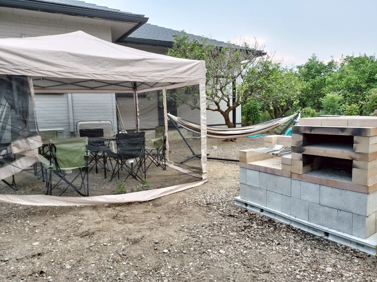 Szia! Privát 107 m2-es ház Mihamában, Wakayamában. 4–5 vendégnek megfelelő, de legfeljebb 12 főnek. 3 méteres étkezőasztal, 65 hüvelykes tévé (streaming/YouTube), konyha és 800 négyzetméteres udvar. Élvezd a szezonális gyümölcsszedést, a grillezést vagy a pizzasütőt (kérd előre). Megközelítés: JR Gobo állomás (autóval 9 perc, busszal 18 perc), és parkoló 3–5 autó számára. Tökéletes kiindulópont Koyasan (2 óra) és Kumano Kodo – Takijiri Oji (1 óra 30 perc) felfedezéséhez. Minősített Kumano Kodo-vezető vagyok, és tippeket vagy vezetett sétákat is tudok biztosítani. Nagyszerű választás vidéki kiruccanásra vágyó családoknak vagy csoportoknak.