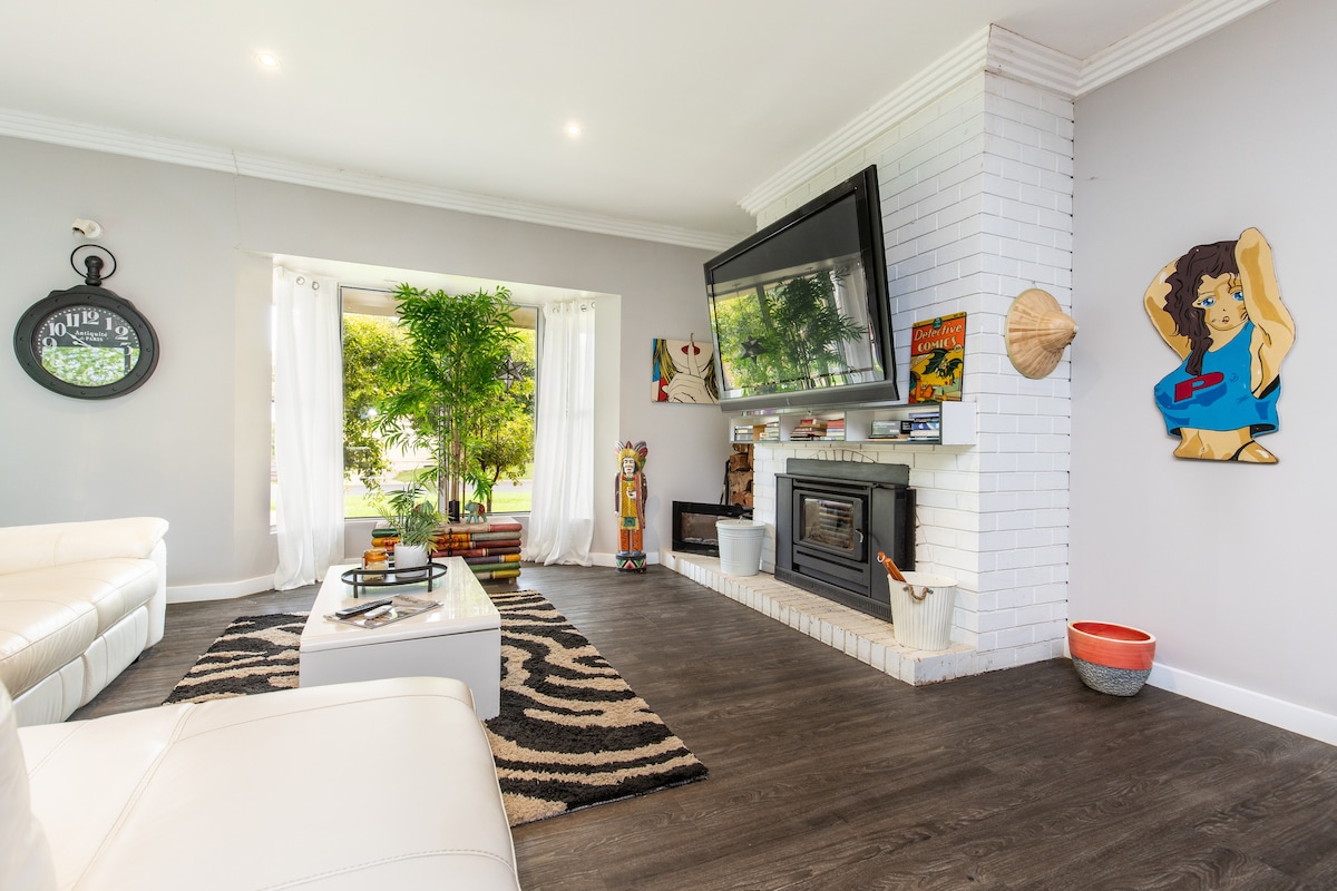 Take it easy at this unique getaway. Discover our newly renovated three-bedroom haven, thoughtfully styled with timeless Art Deco charm. Unwind in the beautifully crafted outdoor bath house,a unique space to relax. Nestled in a quiet street, this home offers peace and privacy while still being close to everything you need. New ducted reverse cycle air conditioning keeps you comfortable all year round. With ceiling fans in all bedrooms. Your perfect getaway awaits -relax and enjoy your stay.