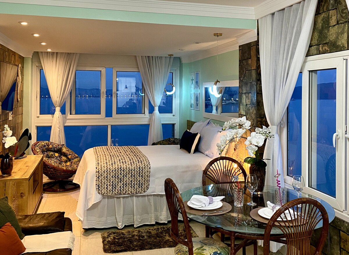 Teljesen felújított loftlakás szabad kilátással a tengerre, a Porchat-sziget híres emelkedőjén. Önálló bejutás elektronikus zárral, légkondicionálás, edények és teljes konyha. 500 megabites internet, kábeltévé és Samsung okostévé. Dolce Gusto multibebidas. Alexa. Fogão, minibár, elektromos grill, serpenyő fondühöz, légsütő és szendvics. Ágynemű és hajszárító. 100 R$/állat. Vasalóruhák. 220v Outlets and OMO Laundry and MINI MARKET 24 hours. Alapár 2 főre