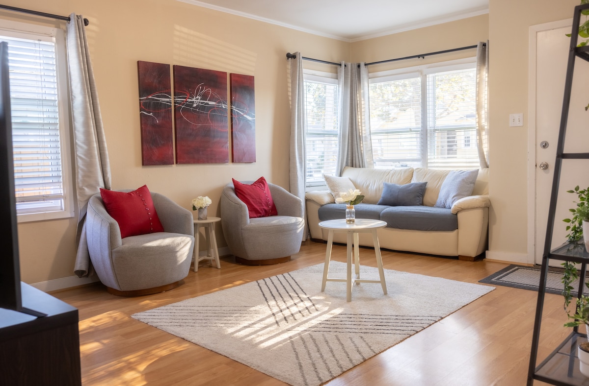 Welcome to our chic and contemporary 2-bedroom, 1-bath house in South San Francisco! Recently renovated, it features 3 comfy queen beds, a 65" TV, and a fully equipped kitchen for up to 6 guests to enjoy. Conveniently near SFO (10 min drive) and transportation hubs, it's your ideal base to explore the Bay Area. Plenty of recommendations as well. Experience comfort and convenience during your stay! (Strict 10 PM Quiet Hour Policy Enforced)