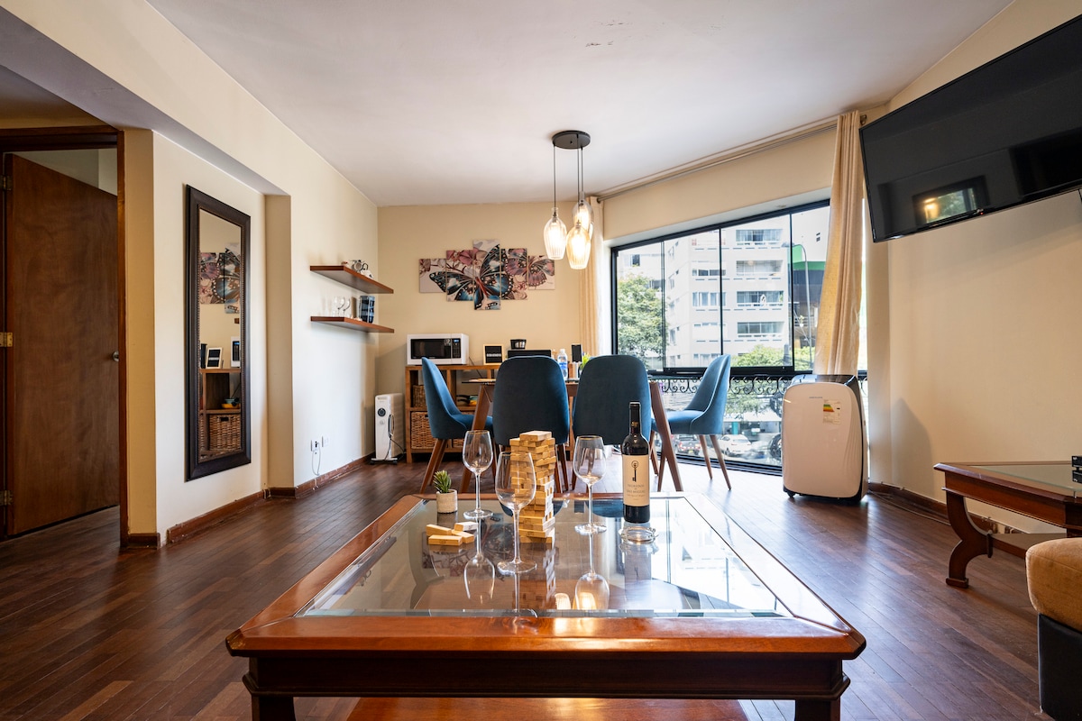 Apartment in Central Miraflores Room with queen bed, 50 inches Smart TV, private washing machine and Dryer , sofa bed, well-lit, in the heart of Miraflores, one block from Kennedy Park. Fourth floor in a residential area with excellent transport links, perfect for long stays, tourism, or business trips. Private bathroom Wi-Fi and Smart TV Kitchen equipped with dining table for 4 people Guest assistance and guidance.