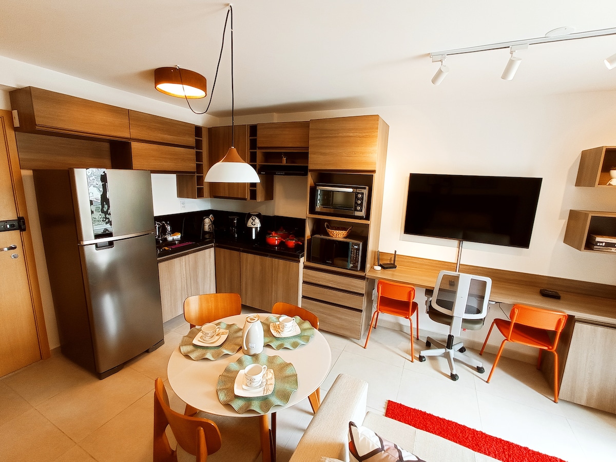 Stúdió a központban , teljesen berendezett és egy lakás teljes szerkezetével. Hangulatos és praktikus. Televízióval(GLOBOPLAY és Amazon Prime), wifivel, teljes konyhával, légsütővel, D33 kétszemélyes ággyal, minden tervezett bútorral, kanapéval, ággyal és fürdőszobával rendelkezik, mindig tiszta és büdös! Közös mosoda a garázsban. A város központjában, a Halfeld Park és a Rio Branco Avenue közelében. Könnyű hozzáférés szupermarketekhez, éttermekhez, pékségekhez, bankokhoz és általános üzletekhez. Nagyszerű ár-érték arány!