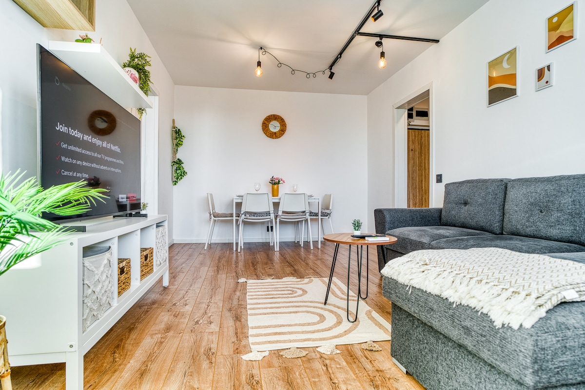 Modern és hangulatos 1 hálószobás lakás a Plaza Mall és az Afi Mall közelében, Bukarest központjához közel. Világos terek, kihúzható kanapé, okostévé és teljesen felszerelt konyha Nespressóval.Élvezd a Rituals piperecikkeket, a pihentető erkélyt és az ingyenes parkolást. Tökéletes legfeljebb 3 vendégnek, akik kényelmet, stílust és könnyű hozzáférést keresnek a metróhoz, parkokhoz, éttermekhez, kávézókhoz és a városi élethez.