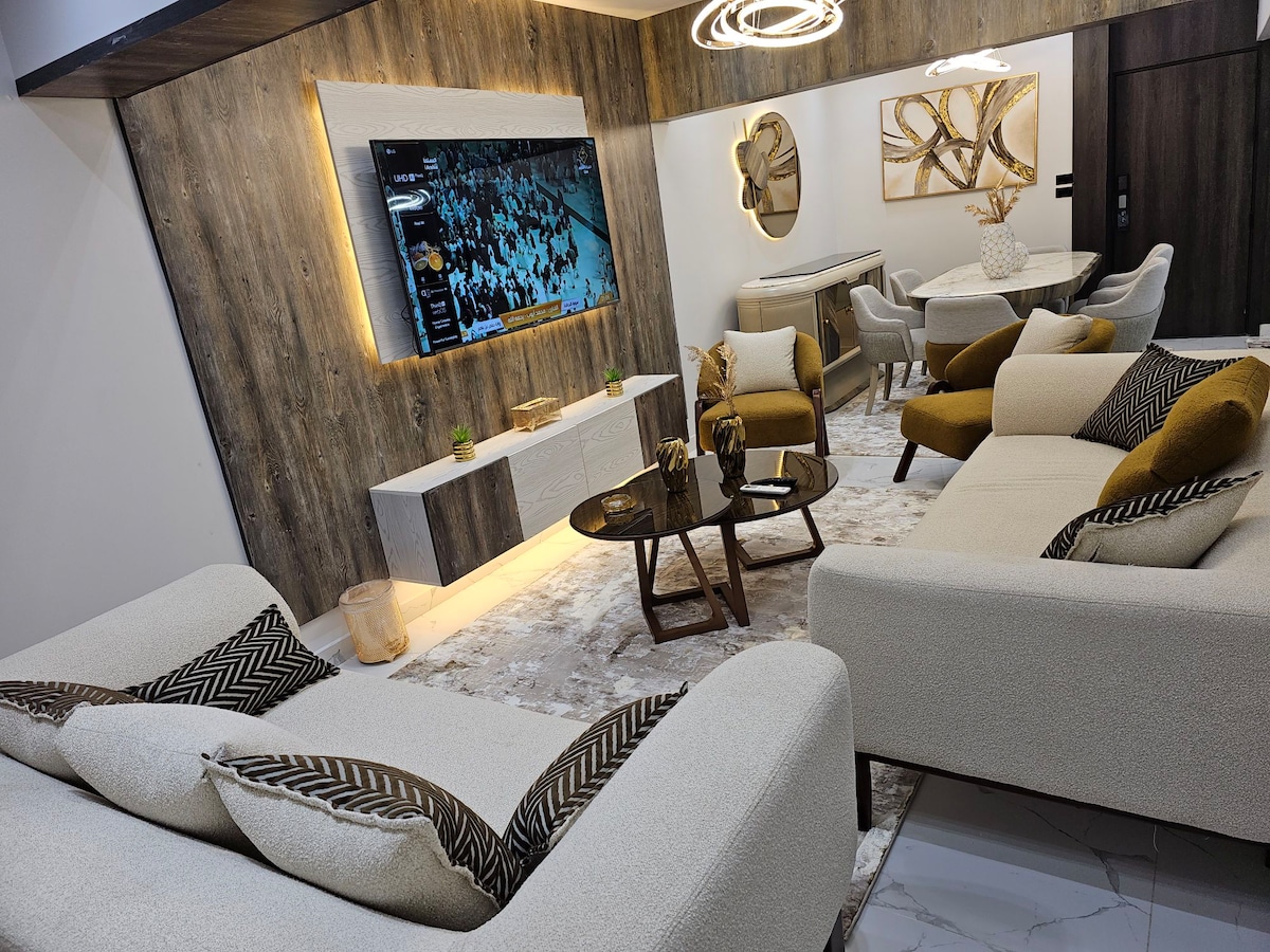 Experience luxury living in this exquisite three-bedroom apartment, Each of the three rooms has a view of the pyramids and the new Egyptian Museum. Two of the three rooms have a Jacuzzi., creating a seamless blend of comfort and grandeur. Perfectly situated, this apartment is a true oasis for those seeking an extraordinary lifestyle.There is also a reception with a corner, a dining room, and a balcony overlooking the pyramids and the Grand Egyptian Museum.