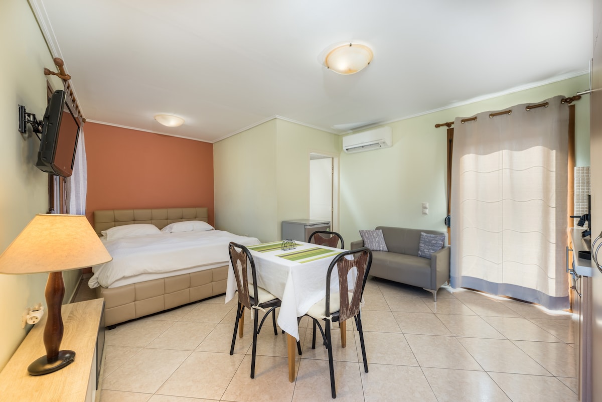 Gyönyörű,csendes, átgondolt és újonnan épült földszinti stúdió egy lakóépületben, a város legközpontibb részén, közvetlenül az Ermou utca mellett. Nagyon közel a piachoz, számos üzlet,szoupermarket, kávézó és bár. Ideális hely azok számára, akik gyalog szeretnének mozogni. Aothere elegendő parkolóhely az utcán. 10 perc sétára van a strand és a Tsamakia liget. Modern berendezésű, és minden szükséges felszereléssel rendelkezik.