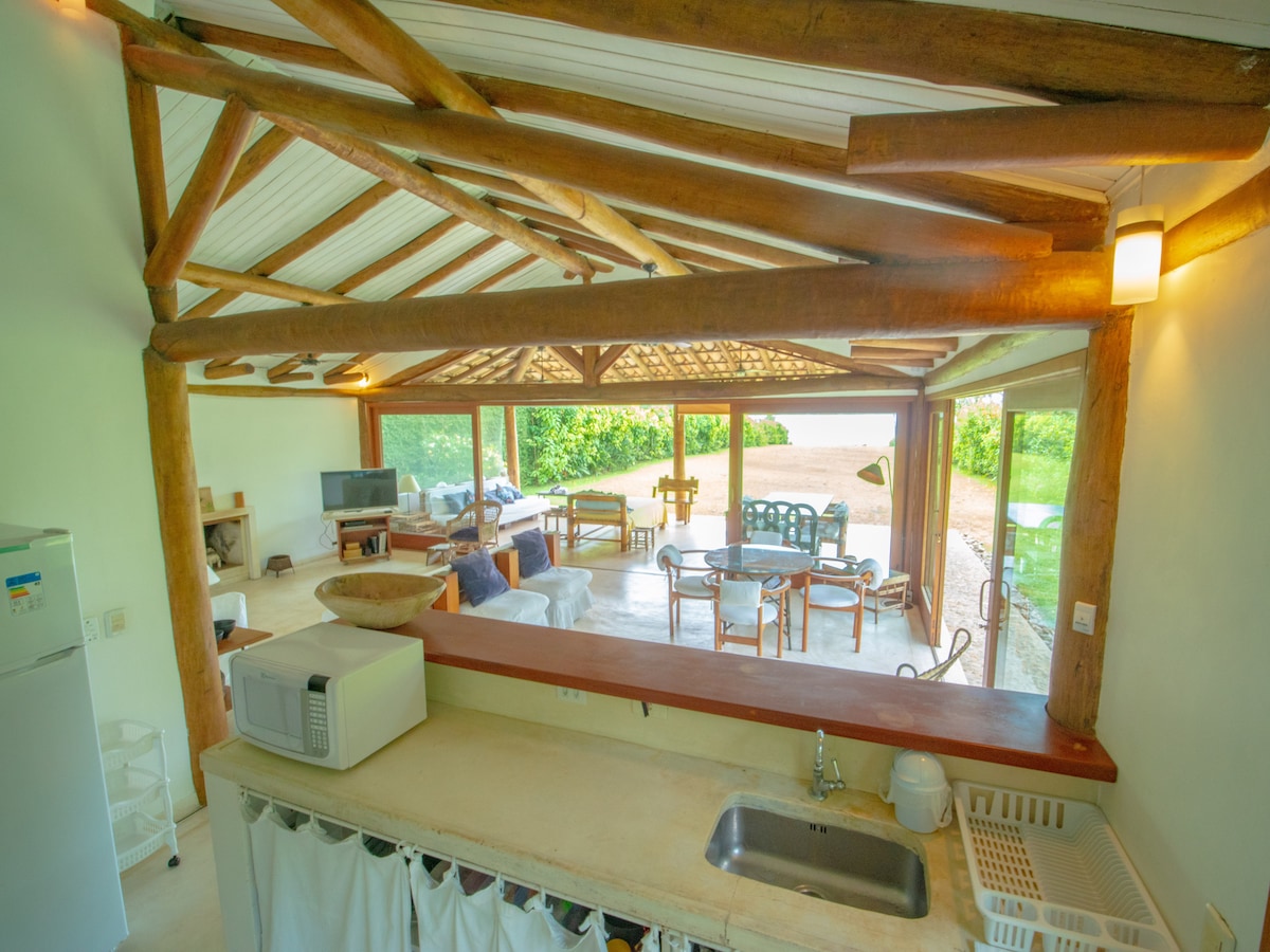 A Carlos Lemos által tervezett házunk a földszinten található, tágas és szuperfényes. Kiváltságos kilátást nyújtó terepen található a tengerre és a hegyekre. Az atlanti erdő veszi körül, kevés szomszéddal, körülbelül 500 méterre a strandtól. A ház meglehetősen fel van szerelve teljes konyhával és mosodával, és gyors internettel (100 Mb) rendelkezik Wi-Fi-vel minden szobában. A nappaliban kandalló található, a kültéri erkély pedig meglehetősen széles terasszal, függőágyakkal és hordozható grillezővel.