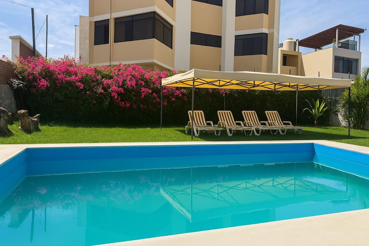 "Vive la mejor experiencia en Mejía en esta espectacular casa de playa, perfecta para familias y grupos de amigos. Disfruta de una piscina privada solo para ti, zona de parrilla, WiFi y cable para relajarte. Con capacidad para 14 personas, cuenta con 4 amplias habitaciones y 11 camas. Ubicada en una zona tranquila, a solo 5 min de la playa, frente a un parque con cancha de frontón y a pasos de la laguna de Mejía. Espacio, comodidad y diversión en un solo lugar. ¡Reserva ahora y hazlo tuyo!"