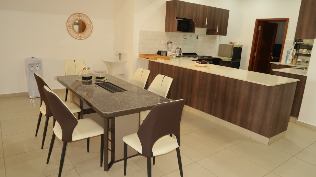 Ez az egység Nyali városában található, az 5th Avenue mentén. 9 perc sétára a strandtól -7 perc sétára a Nyali Center és más bevásárlóközpontok, éttermek és szupermarketek - Teljesen felszerelt konyha – Gyors optikai Wi-Fi - Tiszta úszómedence - 25/30 perc a repülőtérre és az SGR-re - Látnivalók közelsége - Csendes és biztonságos családi környezet - Takarítás két nap után - Nonstop biztonság és ingyenes parkolás Tökéletes üzleti utazóknak, pároknak vagy kis családoknak, és központi elhelyezkedésének köszönhetően Mombasa minden kínálatához hozzáférhetsz.