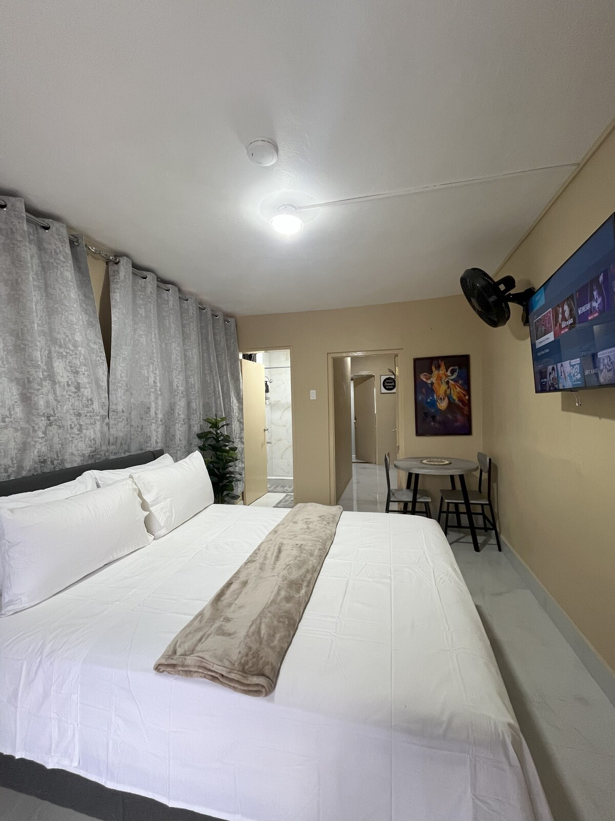AZ EGYSÉG A KÖVETKEZŐKET TARTALMAZZA: *Nagyméretű ágy * Légkondicionálás * Falra szerelhető síkképernyős TV *Teljes tűzhely * Teljes hűtőszekrény *vízforraló *mikrohullámú sütő *modern stílusú csempés fürdőszoba * Esőzuhanyfej * Lebegő hiúság *Mennyezeti ventilátor * kijelölt parkolóterület * Wifi *Kábel *Meleg víz *mozgásérzékelő világítás * a King Alarm Security védi