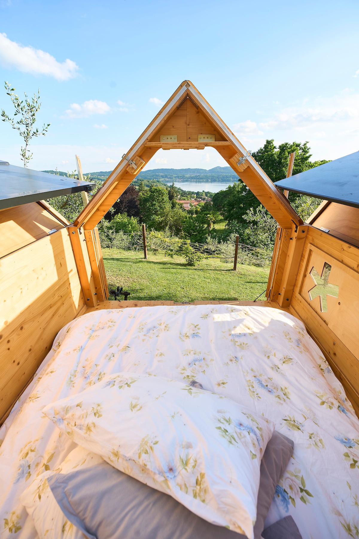 Federica proposes a small wooden nest on a balcony of olive trees overlooking the lake which, by opening the roof, allows you to enjoy a memorable starry night at night and a breathtaking view of the lake in the morning, all without giving up any kind of comfort: on the near terrace for exclusive use a veranda for the rich homemade breakfast, hydromassage tub or Finnish tub (OPTIONAL EXTRA ASK PRICE)depending on the season for a break in nature and pampering in an area with 1000 activities to do