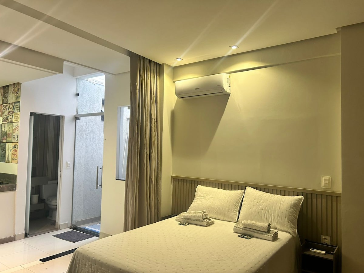 Apartamento 1 quarto em área nobre de Montes Claros, próximo a restaurantes, shoppings, clínicas e muito mais. Conta com 2 vagas de garagem, 2 elevadores, academia, lavanderia coletiva (uso pago), loja pegue e pague com câmeras, salão de festas (mediante agendamento) e portaria 24h. Para estadias acima de 20 dias, incluímos faxina semanal. Ideal para quem busca conforto, praticidade e ótima localização. Ambiente 100% climatizado e com smart tv. Atenção: reservas 2 ou mais diárias.
