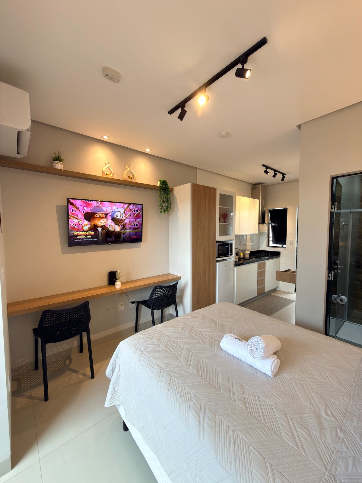 Flat para pessoas exigentes! porteiro 24hs Local extremamente seguro Vaga para 2 carros academia salão de jogos sauna 2 elevadores Mercado inteligente não interior do prédio com sistema de pegue e pague Bairro classe A,08 mi do centro Ambiente 100% climatizado Cama SUPER KING. Todos utensílios de cozinha para te proporcionar praticidade; tv smart sala e quarto Perto das principais faculdades Muito perto de padaria, farmácia restaurantes, muito perto shopping Ibituruna
