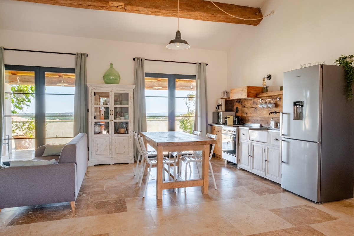 Gyere és szállj meg egy atipikus mazetben, amely antik anyagokból készült, átgondolt dekorációval. Az étkezések a teraszon élvezhetők, és csodálatos kilátást nyújtanak a Mont Ventoux és a Montfrin kastélyra. Pihenés biztosított a medence melletti gyepen a medence szélén, egy pétanque-i játék után. Látogass el gyönyörű régiónkba, Provence és Camargue között, amely tele van hagyományokkal, műemlékekkel, történelmi városokkal és nyári bulikkal.