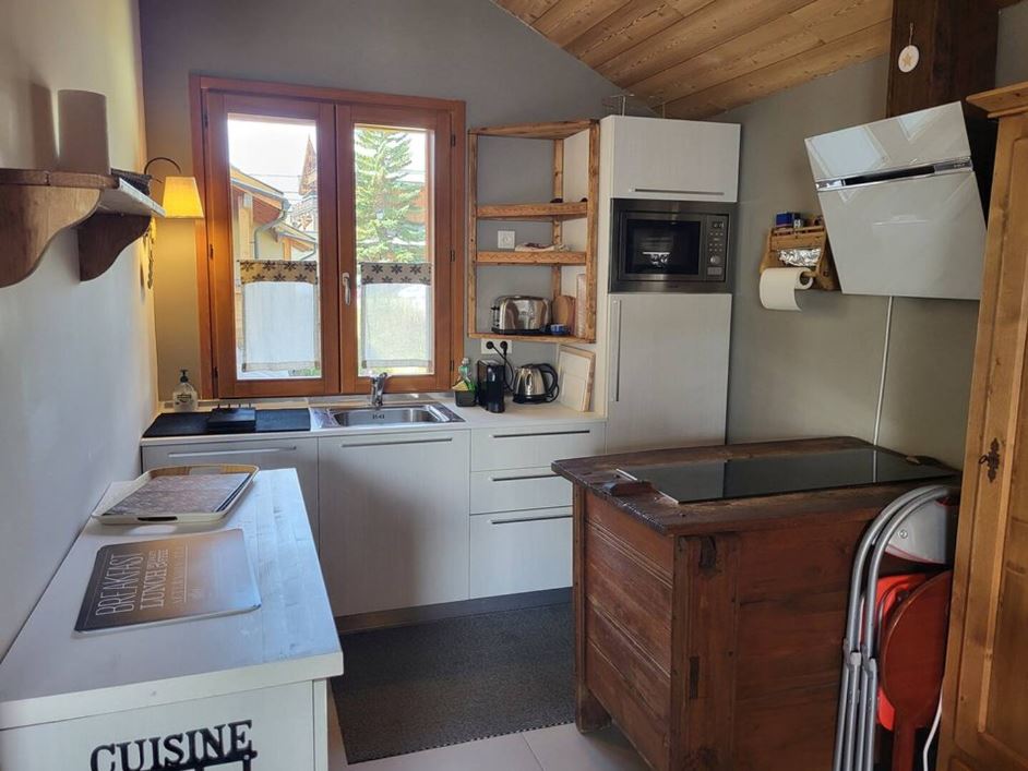 En rez-de-jardin, appartement de 55m2, plein sud, meublé dans un style à la fois moderne et montagne. Vue sur les sommets. Séjour spacieux avec canapé, télé 127cm. 2 chambres avec lits de 160cm, grands placards et penderies. Une chambre avec TV. Terrasse et jardin de 60m2. Pour votre confort, en complément des équipements de base, vous trouverez bouilloire, grille-pain, appareil à raclette/grill/crêpière, appareil à croque-monsieur/gaufres...Le ménage de fin de séjour est inclus.