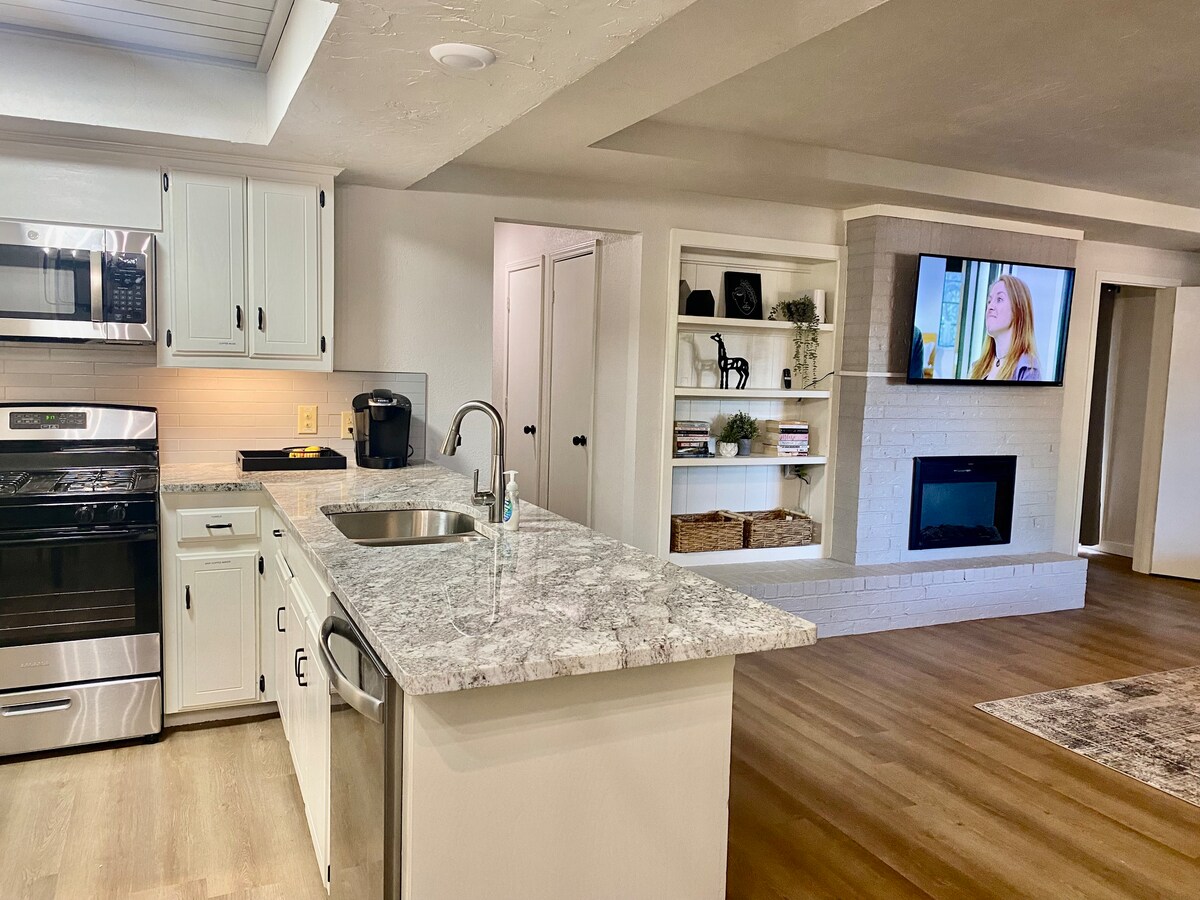 THIS IS A DUPLEX. Very quiet 3 bed 2 full bath offers unique private front courtyard, and back outdoor living room with TV & grill. Modern interior filled with art. Open living/dining/kitchen. Primary bedroom suite features KING size bed, 55” Smart TV, and spacious bathroom with walk-in shower. Secondary bedroom features KING size bed and TV. Perfect location minutes to restaurants and shopping. Out of town guests only. Easy access to all major interstates. Pets allowed ($40 per stay. )