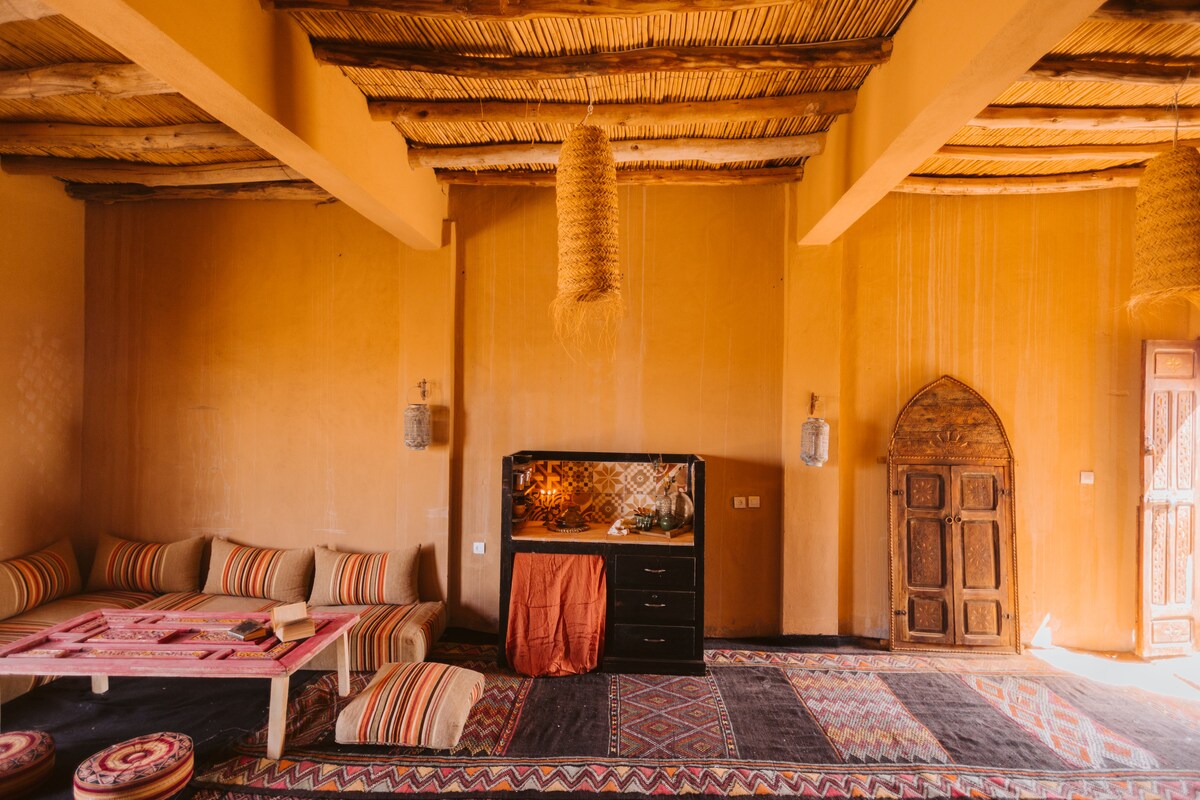 A lakás a semmi közepén található, dűnékkel körülvéve, így a turizmuson kívül nagyon privát módon élvezheted az igazi sivatagot. Ha szeretnéd, reggelizhetünk és vacsorázhatunk a környéken. Az éttermet a galériában láthatod. A lakás a szintén bérelt főházhoz van csatolva. Jelenleg, ahogy a fényképeken is láthatod, van egy franciaágy, de ha többen vagytok, az igényeidnek megfelelően biztosítunk pótágyat.
