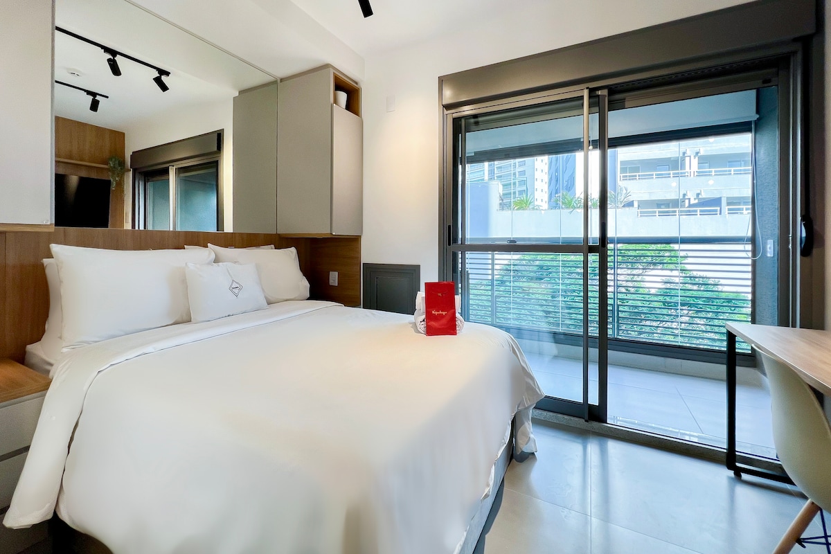 Modern stúdió, gyönyörű kilátás ,jól berendezett erkéllyel , teljes konyhával, minibárral , teljes víkendházzal. Magas emelet. Internet 250 megabit, okos TV, légkondicionálás és higiénikus zuhany. Fantasztikus elhelyezkedés, közel a bevásárlóközpontokhoz JK Iguatemi és Vila Olímpia , Hípica Paulista és az egyetemek Insper, FMU és Anhembi-Morumbi.1 garázsterület. Épület fitneszközponttal, szoláriummal , kerékpárokkal, úszómedencével , mosókonyhával, coworkinggel, mini autonóm piaccal. Nézd meg a 3 vendég árát
