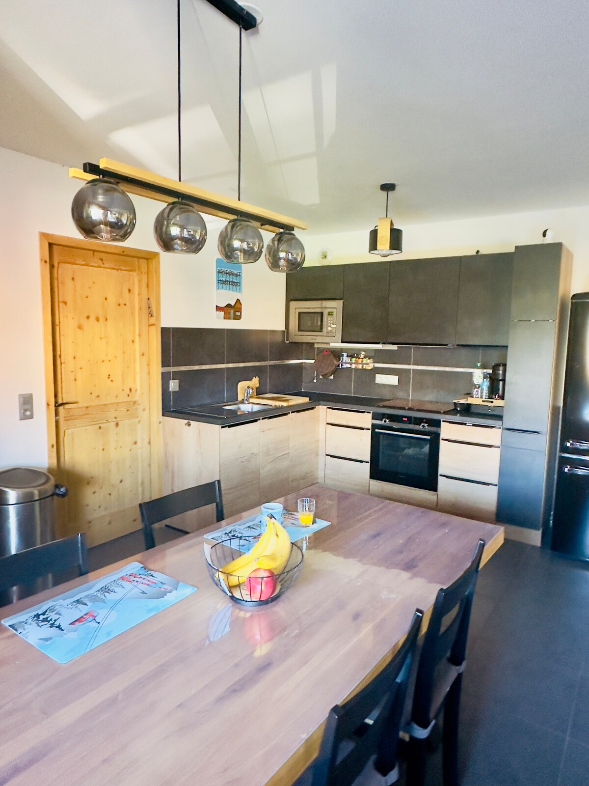 Très beau duplex spacieux, pied des pistes, des cours de ski de Flaine Forêt, plein sud, dernier étage, 7 à 8 personnes. Comporte deux vraies chambres (lit double et deux lits simples) et un coin montagne avec lit superposé. Il y a deux couchages supplémentaires dans le canapé lit du salon. Une salle de bain, une salle de douche avec WC et un WC indépendant. Casier à skis et parking souterrain payant (65€). La résidence dispose d'une piscine gratuite. Sauna, hammam et lave linge payants. Balcon