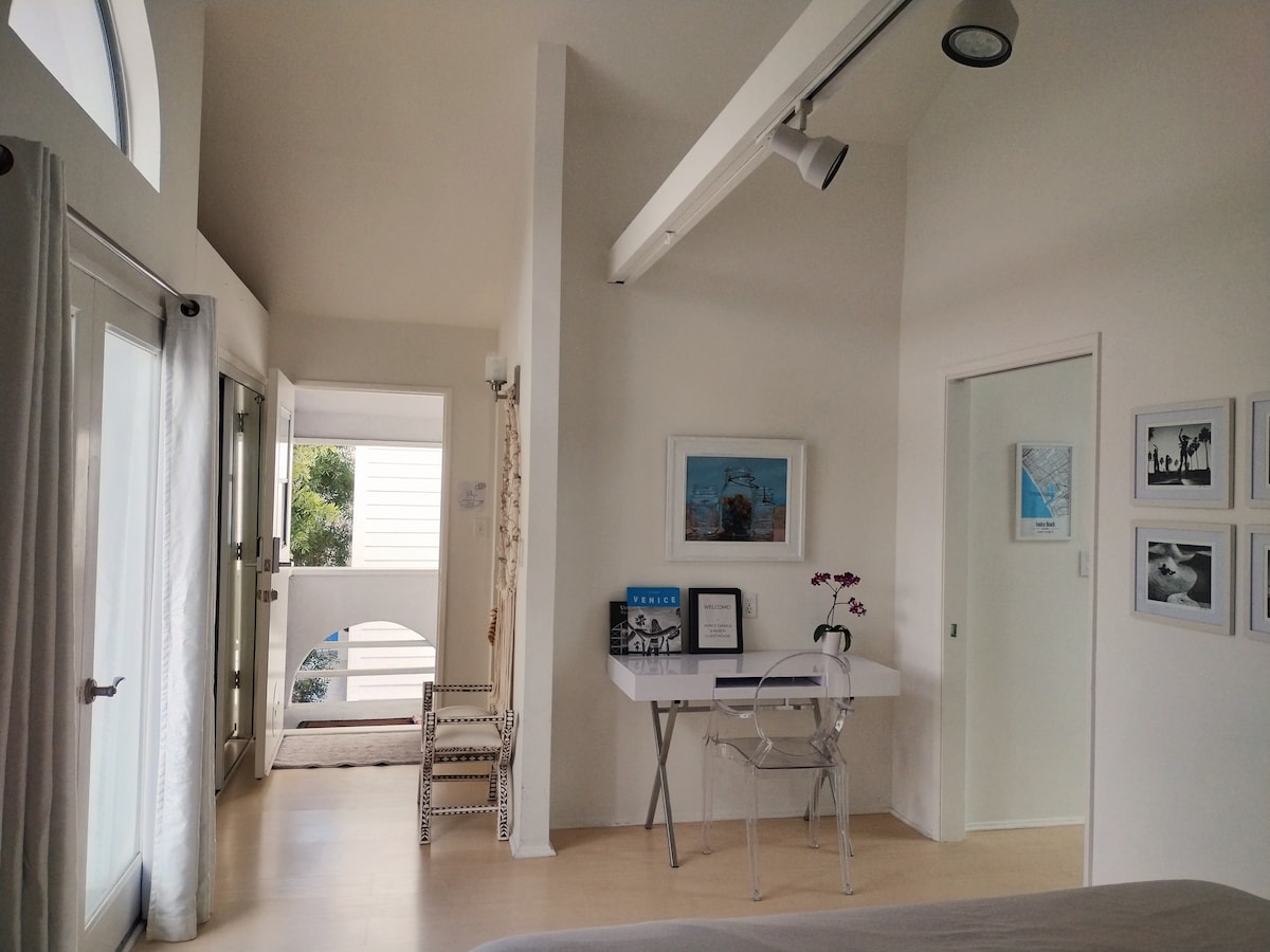 Rare Guest House in the Venice Canals, 2 blocks from the beach. Sunny & private with high A-frame ceilings, french doors leading to 2 balconies, a King size bedroom with an incredible Duxiana mattress, modern kitchenette, a comfortable living room with a flatscreen TV w/ streaming & fast Wi-Fi, dedicated workspace, mirrored closet, books & local art. Fully walkable area. Amenities: 1 garage parking, laundry room, 2 stand-up paddle boards, vintage rowboat, 2 bikes, beach chairs & umbrella.