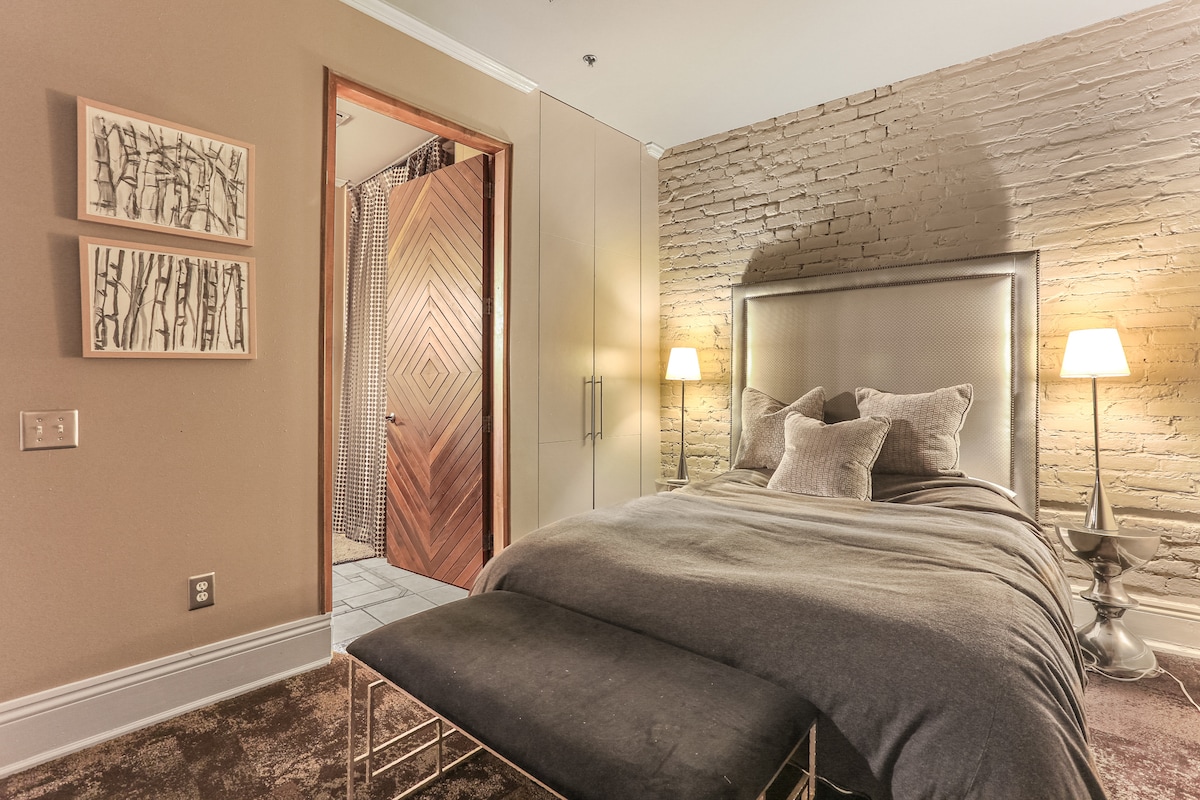 Peace and Tranquility. 200 hundred years old meets modern. This Historic Revival features two century old exposed brick and hardwood ceilings! This bedroom suite features two king beds and a futon! Enjoy walking 2 blocks to the French Quarter, 1 block to Harrah's Casino, 6 blocks to bourbon street and 7 blocks to the World War 2 Museum! This is the most beautiful boutique apartment in Downtown New Orleans!