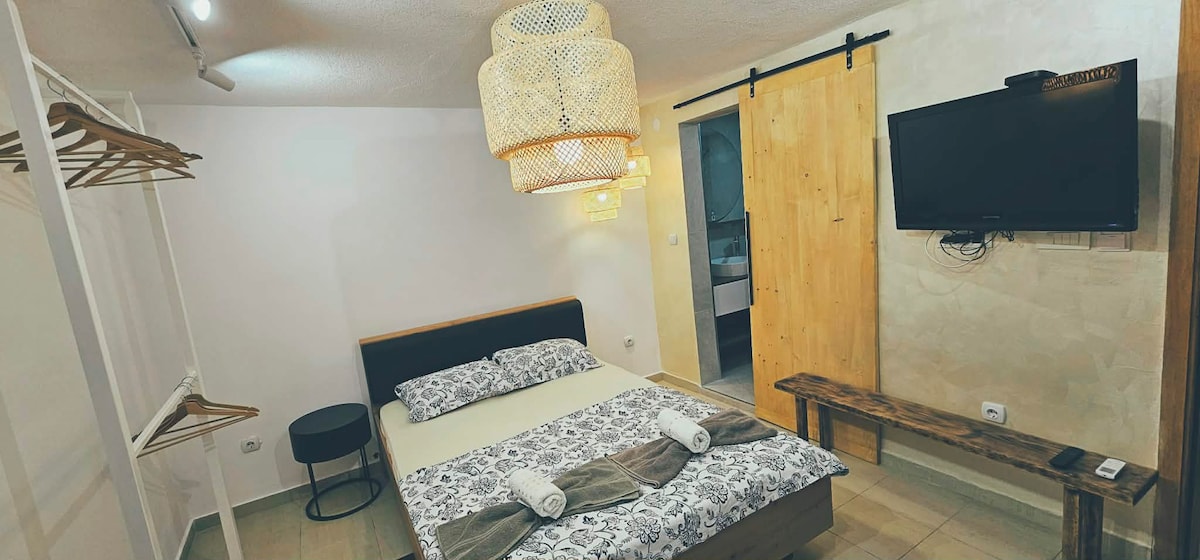 MARE is ideal for guests looking for a cozy, private, and comfortable stay in a peaceful garden setting. The studio features a bedroom area, a private bathroom, and a small kitchen. The space is perfect for couples or solo travelers who appreciate simplicity, cleanliness, and modern comfort. Has a private terrace with garden view, offering a quiet outdoor space to relax, enjoy your morning coffee, or unwind in the evening. Escape to calm—book Suite Mare today.