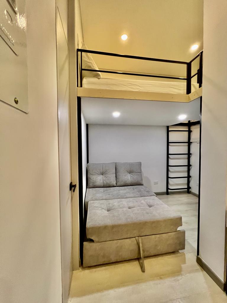 Apartment type Loft 202 for brand new, large lighting, it has 1 double bed, Smart TV, desk, unlimited internet Wi-Fi, kitchen equipped with full kitchen, private bathroom with hot water, laundry service and dryer in free building, second floor, stairs, It is located in a quite commercial area near supermarkets, banking area, university and restaurants, near Transmilenio. no parking, public parks a few block away.
