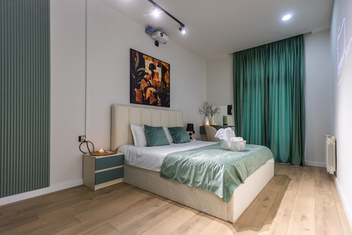 Üdvözöljük a „Terrace Gallery”-ben, ahol minden részlet a kényelmének és örömének van szentelve. Ez az elegáns otthon Tbiliszi szívében található, és magánéletet, kényelmet és egyedi élményt kínál. A vendégeket az ízlésüknek megfelelően kiválasztott grúz borral, friss szezonális gyümölcsökkel, finom csokoládéval, kávéval, teával és üdítőkkel várják. A lakás dizájner belső térrel, városi kilátással rendelkező panorámaterasszal, prémium bútorokkal és intelligens zárral rendelkezik, amely lehetővé teszi az önálló be- és kijelentkezést.