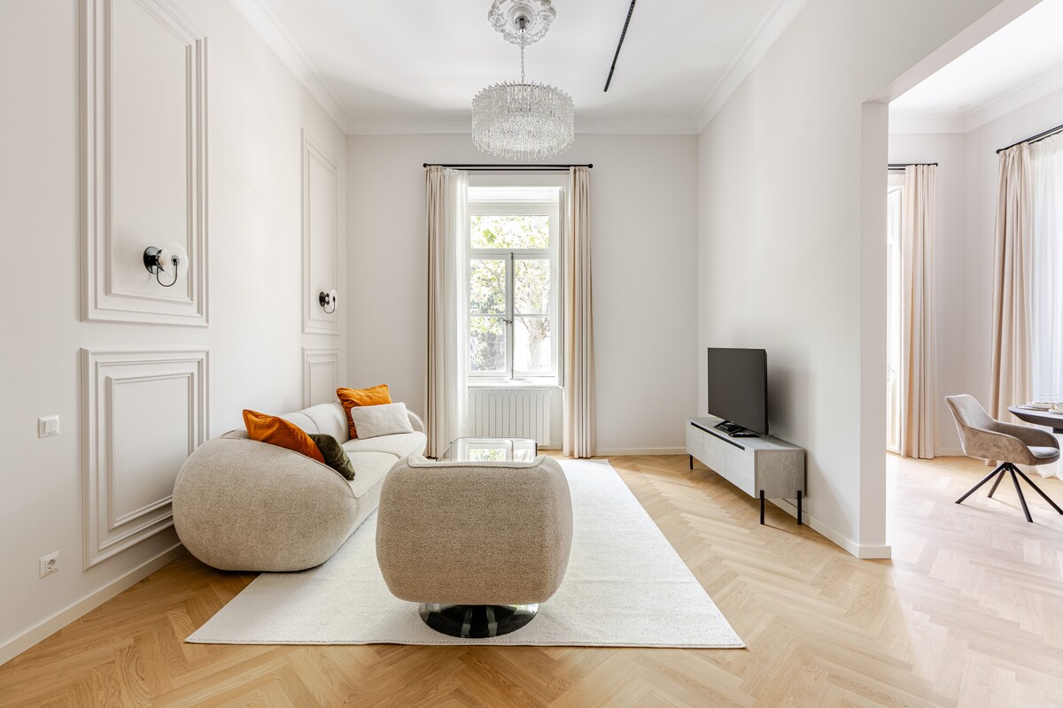 Lépj be az időtlen eleganciába ebben a lenyűgöző, 90 m² -es lakásban, amely Tbiliszi egyik legikonikusabb sugárútján található, és amely 19. századi építészetéről, bájos kávézóiról és kulturális központjairól ismert. Ez a gyönyörűen berendezett lakás 4 méter magas mennyezettel, kifinomult falburkolattal és nyugodt, semleges palettával rendelkezik, amely fényűző, mégis otthonos légkört teremt.