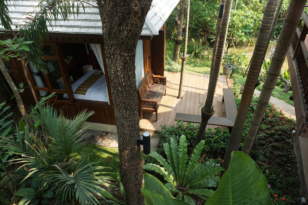 Ez egy privát thai stílusú szoba, amely a villához kapcsolódik, három oldalról zárt udvarral, nagy üvegfalakkal, három oldalról sötétítő függönyökkel, hűvös, de légkondicionált, külön kis hátsó udvar és saját fürdőszoba az udvaron.Az egész udvarom 550 négyzetméter, és van egy kétszintes épület az udvar másik oldalán, a villa mellett, ahol ez a ház található.Környékünk Chiang Mai prémium lakóövezetében található.Sétálj 200 métert a környéken található tóhoz, ahonnan a Suthep-hegyre nyílik kilátás, gyönyörű napkelte és napnyugta.A környéken található egy 4 km-es körgyűrű, ami nagyszerű lehetőség a kerékpározáshoz és a gyalogláshoz.Ez a szoba a másik vadon többi szobájától elkülönítve bérelhető, mint különleges árú szoba, privát és privát.Az ágynemű természetes latex matrac, bár olcsó és ugyanolyan minőségű, mint a villa többi szobája.Az ágyaknak és a bútoroknak teakfának kell lenniük.Okos választás az utazáshoz és az ár-érték arányhoz.
