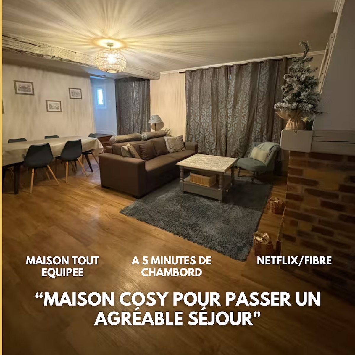A Domaine de Chambord (1,4 km) és a La Loire (500 m) bejáratától néhány száz méterre található. Korábbi farm/sajtó, kényelmes, felszerelt házunk akár 14 fő elszállásolására is alkalmas, otthonos és meleg légkörben. Szállj meg 2/4/6 fő részére. A lehetséges árak nem haboznak! A fatüzelésű kályhával, 500 m² -es erdős és fallal körülvett kerttel rendelkező házban 4 hálószoba, 2 félemelet, 2 fürdőszoba és minden szükséges felszerelés található a szálláshelyen.