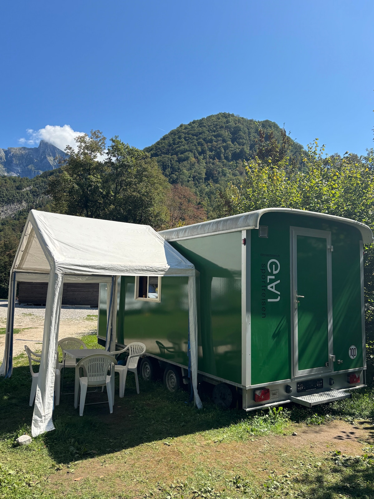 Drei liebevoll ausgebaute, etwa 12 m² große Bauwagen mit Holzmöbeln stehen für Sie bereit. Jeder Wagen ist rund fünf Meter lang, funktional und gemütlich eingerichtet und bietet Platz für 1–4 Personen. Die Sanitäranlagen des Campingplatzes werden gemeinschaftlich genutzt. Der Standort im ruhigen Camp Lazar im Soča-Tal bietet direkten Zugang zum Fluss. Besonders im Frühjahr genießen Sie klare Luft, wenig Betrieb und ideale Bedingungen für aktive Tage in der Natur.