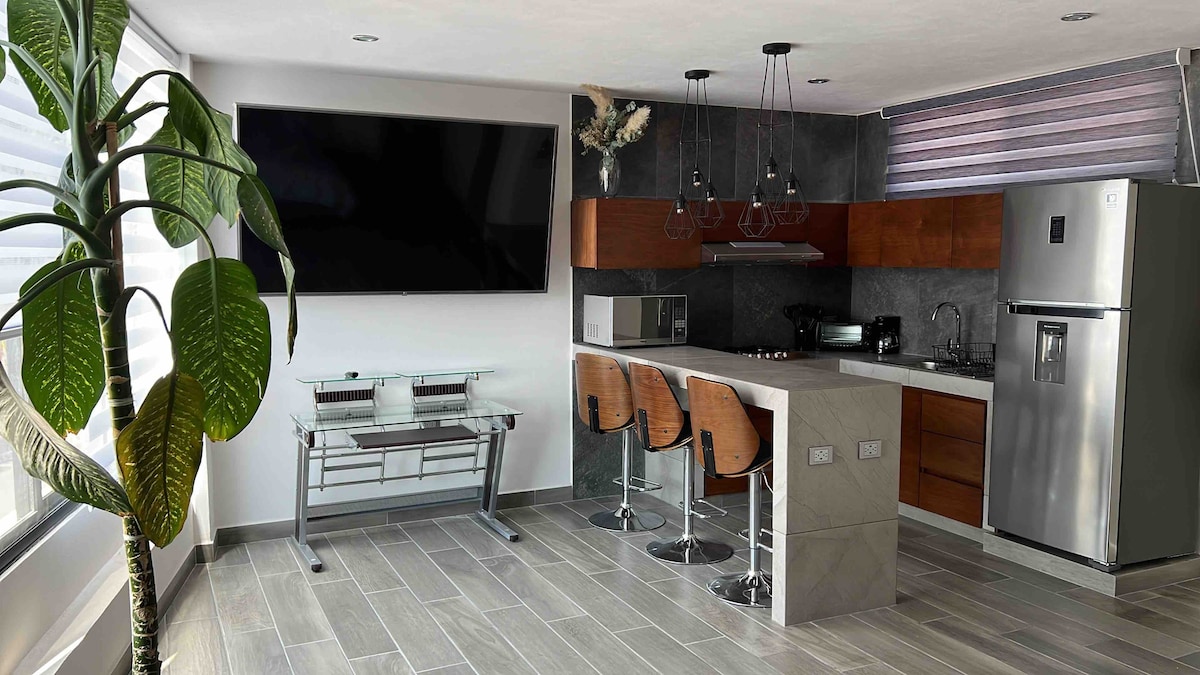 - Üzleti stílusú apartman ipari stílussal. Élvezd a szállást egy új és modern lakásban, kiváló kényelmi szolgáltatásokkal és rendkívüli helyen. - Minden szükséges kényelmi szolgáltatással rendelkezünk, hogy a szálláshelyen töltött időd a lehető legélvezetesebb legyen. Légkondicionálás, nagy sebességű wifi. - Élvezd az éttermek, bárok és érdekes helyek széles választékát, amelyeket az Av. Juárez és Cerro de la Paz csak néhány percnyire van.
