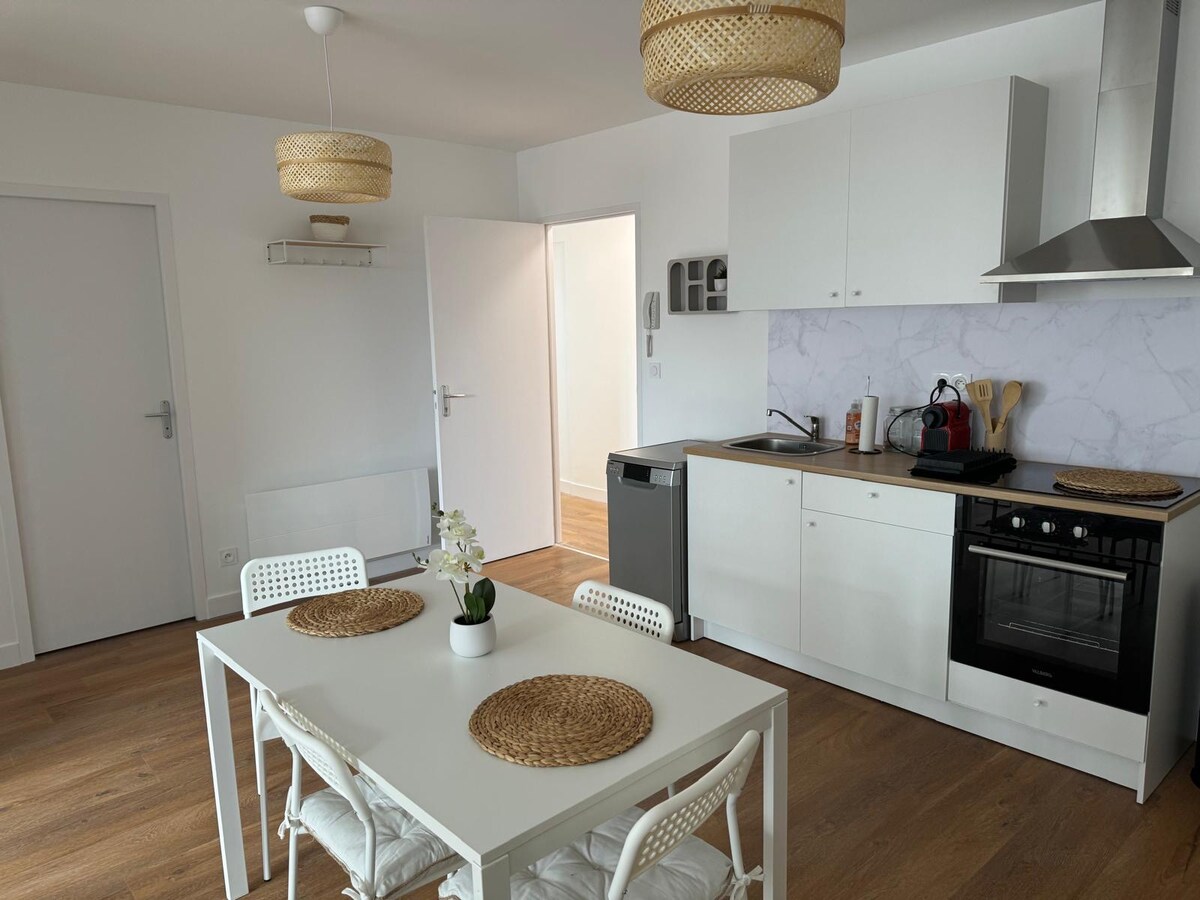 Üdvözlünk ebben a világos, teljesen felújított, tágas és barátságos, 55 m²-es, egy hálószobás lakásban. Ideális helyen, a városközpontban, a prefektúrától néhány lépésnyire és a vasútállomástól kevesebb mint 10 perces sétára található, tökéletes üzleti úthoz vagy romantikus kiruccanáshoz. Belül a következőket találod: • egy nagy nappali teljesen felszerelt konyhával • egy hálószoba franciaággyal és íróasztallal • beépített gardrób/mosókonyha • fürdőszoba és külön WC • optikai Wi-Fi