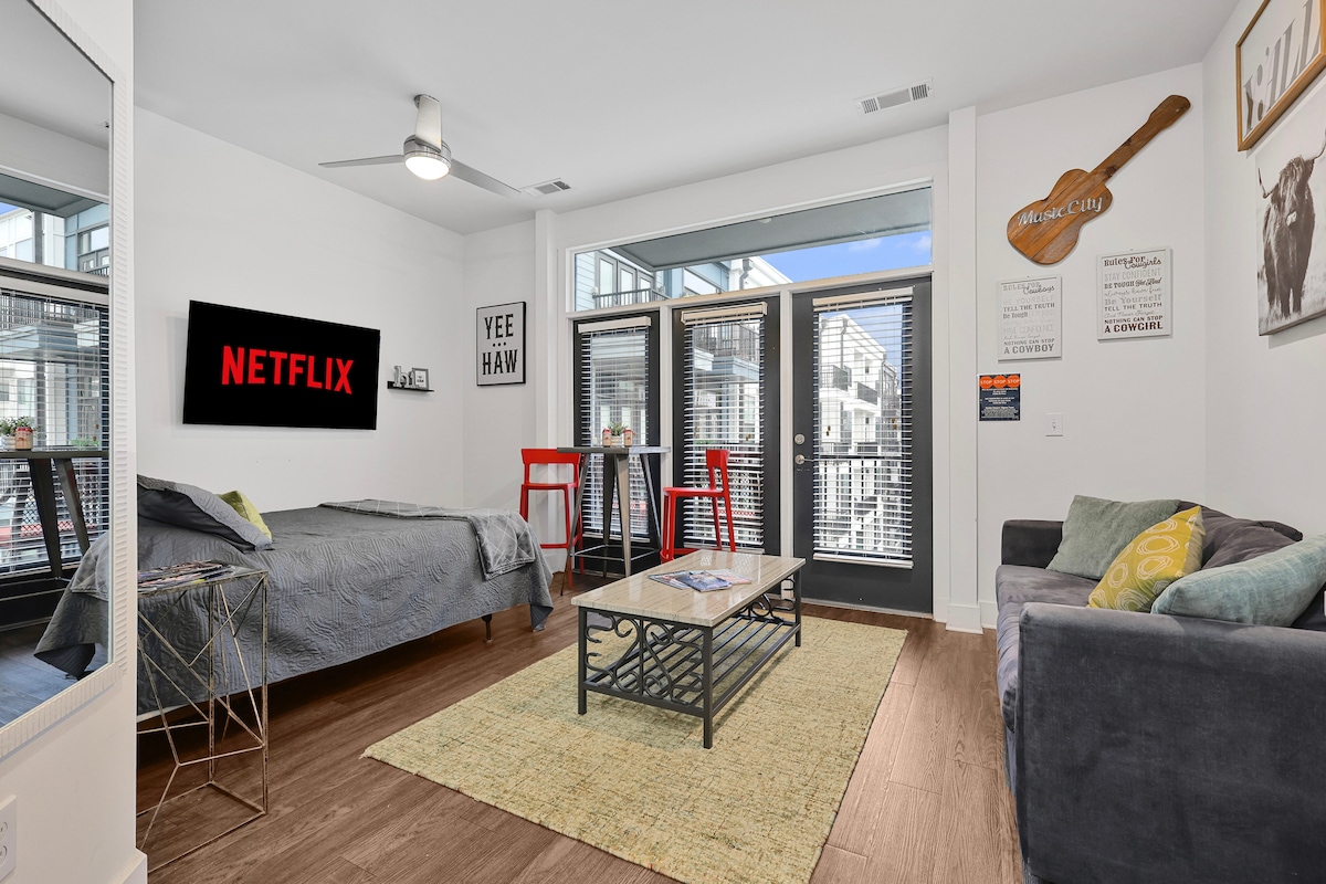 Fedezd fel a kifinomult luxust Music City szívében. ✔️ Tágas, 1 hálószobás lakosztály ✔️ 2 king méretű ágy ✔️ Légkondicionálás ✔️ Okostévé ✔️ Erős Wi-Fi ✔️ Saját erkély, amely üdülőhelyi stílusú medencére néz (hűvösebb hónapokban fűtött) ✔️ Teljesen felszerelt konyha ✔️ Különálló mosoda ✔️ Gardróbszekrény komóddal ✔️ Lépések az élő zenéből, az étkezésből és az éjszakai életből ✔️ Fitneszközpont mászófallal ✔️ Közösségi grillek ✔️ Átgondoltan berendezett az igényes utazóknak ✔️ Helyszíni biztonság ✔️ Parkolás 30 $/éjszaka áron