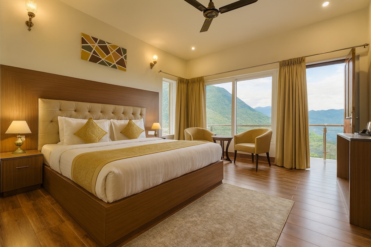 Üdvözlünk a tökéletes hegyi nyaralóban, a mussoorie-i Sapphire Suitesben! Ez a Mountain View Room 1 kényelmet, luxust és lenyűgöző kilátást nyújt a Himalájára – olyan vendégeknek, akik szeretik a nyugalmat, a magánéletet és a prémium vendéglátást. ✨ Amit imádni fogsz: Tágas és elegánsan berendezett hálószoba hangulatos világítással Privát erkély, ahonnan lenyűgöző kilátás nyílik a hegyekre és a völgyre Queen méretű ágy prémium ágyneművel Modern fürdőszoba éjjel-nappal elérhető meleg vízzel