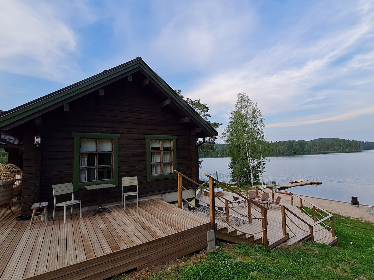 Kétszintes, 128 m2-es rönkház a tóparton, mindössze egy órányira Helsinkitől. A házikóban önkormányzati víz, a földszinten beltéri víz és léghőszivattyúk találhatók. Kisház körülbelül 120m2 terasszal. A kisház földszintjére kívülről lehet bejutni. Az emeleten, a szoba magassága kb. 4 m. Gyerekbarát strandterület. Nyáron a bérleti díj 2 szörfdeszkát és egy evezős csónakot tartalmaz. A takarítás és a törölközők nem tartoznak a bérleti díjba. Nincs életbiztosítás