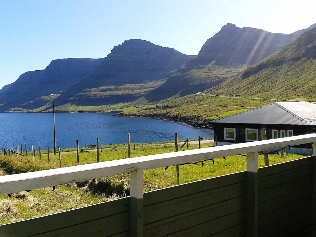 Kő- és faház gyeptetővel egy domboldalon. Nagyon csendes hely, ahol csak juhok, madarak és zöld fű él, ameddig a szem ellát. A ház előtt található a Northatlantic Ocean. Nincsenek szomszédok. Ideális azoknak, akik csendes, nyugodt szálláshelyet keresnek. A ház 2010-ben épült régi, hagyományos feröeri stílusban. 1 hálószobával, vécével, konyhával és nappalival rendelkezik, ahonnan fantasztikus kilátás nyílik.