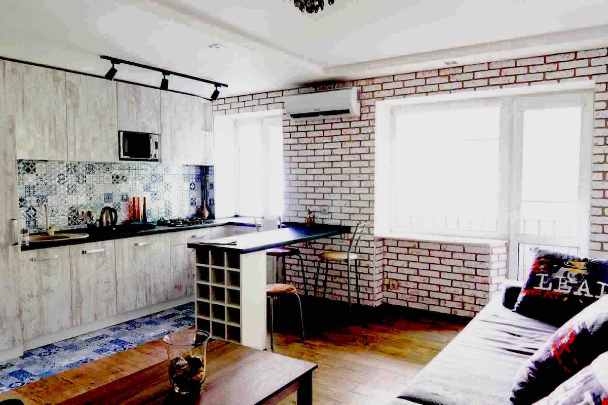 Hangulatos loftlakás Odessza szívében. A legbiztonságosabb elválás. Földszint, önálló hozzáféréssel az udvarhoz. Az udvar közepén található. A falak egy méterre vannak a vörös téglától. Az ablakok kanyargósak. Úgy fogod érezni magad, mintha egy bunkerben lennél, de minden kényelmes körülmény között.