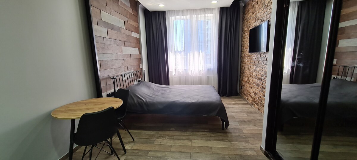Ez a hangulatos stúdióapartman a Primorsky kerületben található Odessa szó szerint 3 perces sétára fekszik a Pobeda Arborétumtól és az Odessa National Polytechnic University sportkomplexumától. A lakberendezés a skandináv és a loft stílusok észszerű keverékeként írható le. A világos tónusok vizuálisan kibővítik a területet, és sokkal tágasabbá teszik a lakást. A hely racionális használata lehetővé tette, hogy mindent elhelyezz, amire szükséged van a modern, dinamikus életmódhoz.