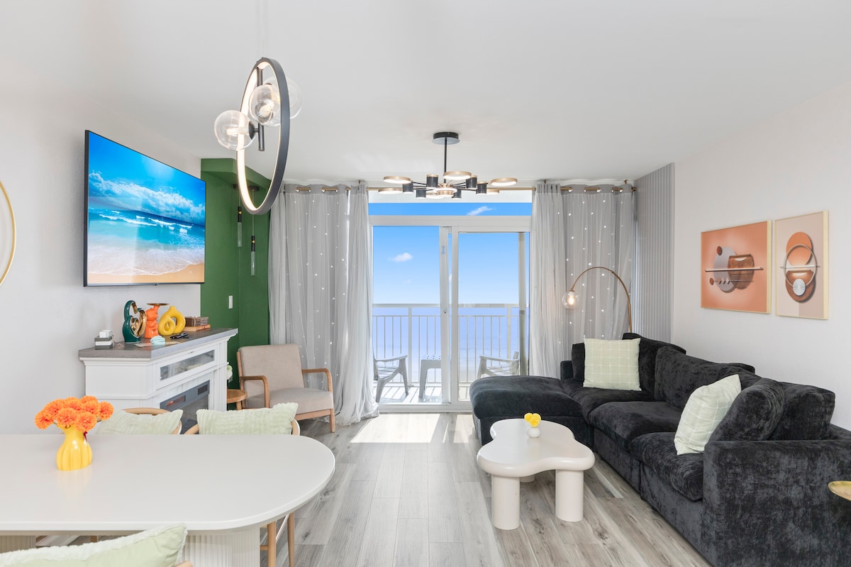 SUMMER IS HERE. DON'T MISS BOOKING YOUR STAY!!! Experience breathtaking ocean and sunset views from our Super Clean, 5-star rated condo on the 8th floor. "OCEAN BLUE" is a spacious 1-bedroom layout with a king size bed, full kitchen, large balcony, smart TVs and a fireplace. Washer\dryer located inside the condo. Located in a prestigious area of Myrtle Beach known as the Golden Mile, minutes away from restaurants, shopping, and attractions. Book Now for the ultimate MB getaway!