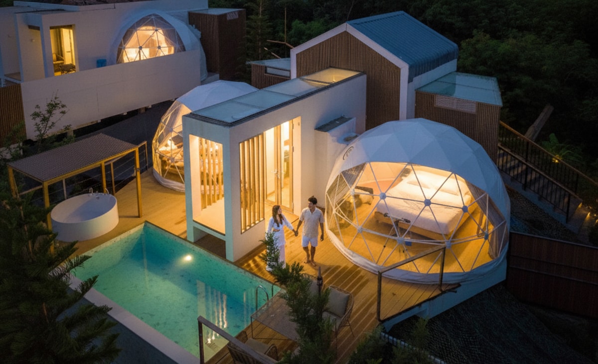 𝐓𝐡𝐞 𝐗𝟏𝟎 𝐇𝐲𝐝𝐫𝐚 𝐃𝐨𝐦𝐞 A harmonious blend of Japanese MUJI-style architecture and Dome Camping amidst nature, designed with a focus on comfort, cleanliness, and simplicity. The use of earth tone colors, minimal patterns, and soft hues enhances emotional connection and creates a serene atmosphere. This thoughtful design brings guests closer to nature while preserving the understated elegance and charm of MUJI’s refined simplicity.